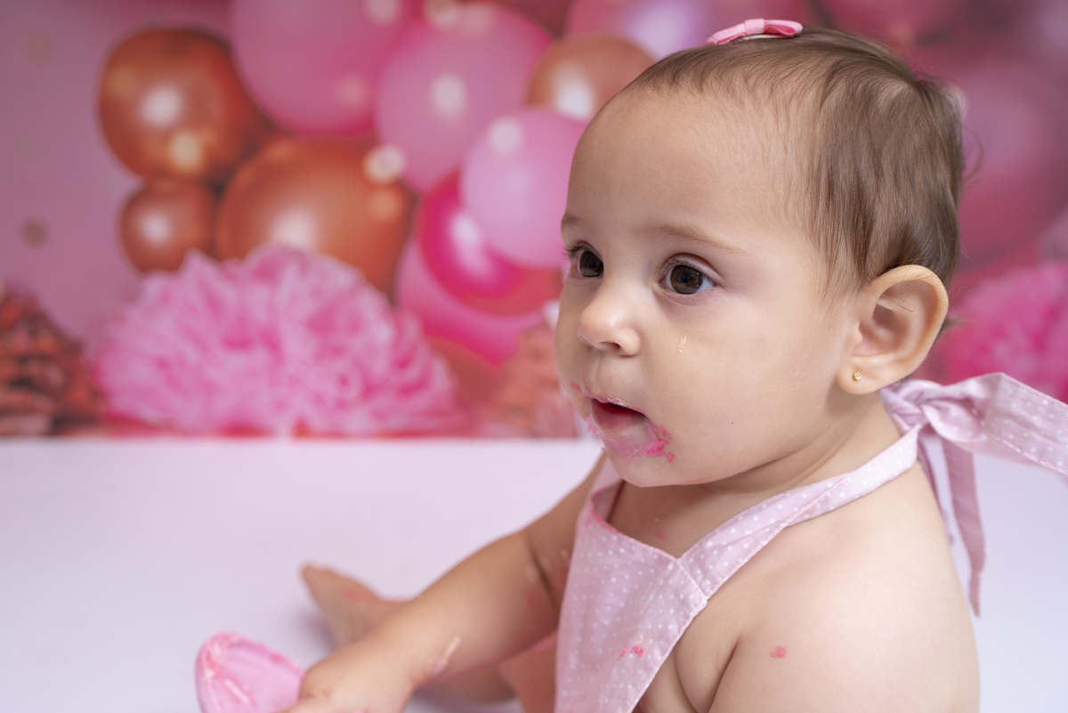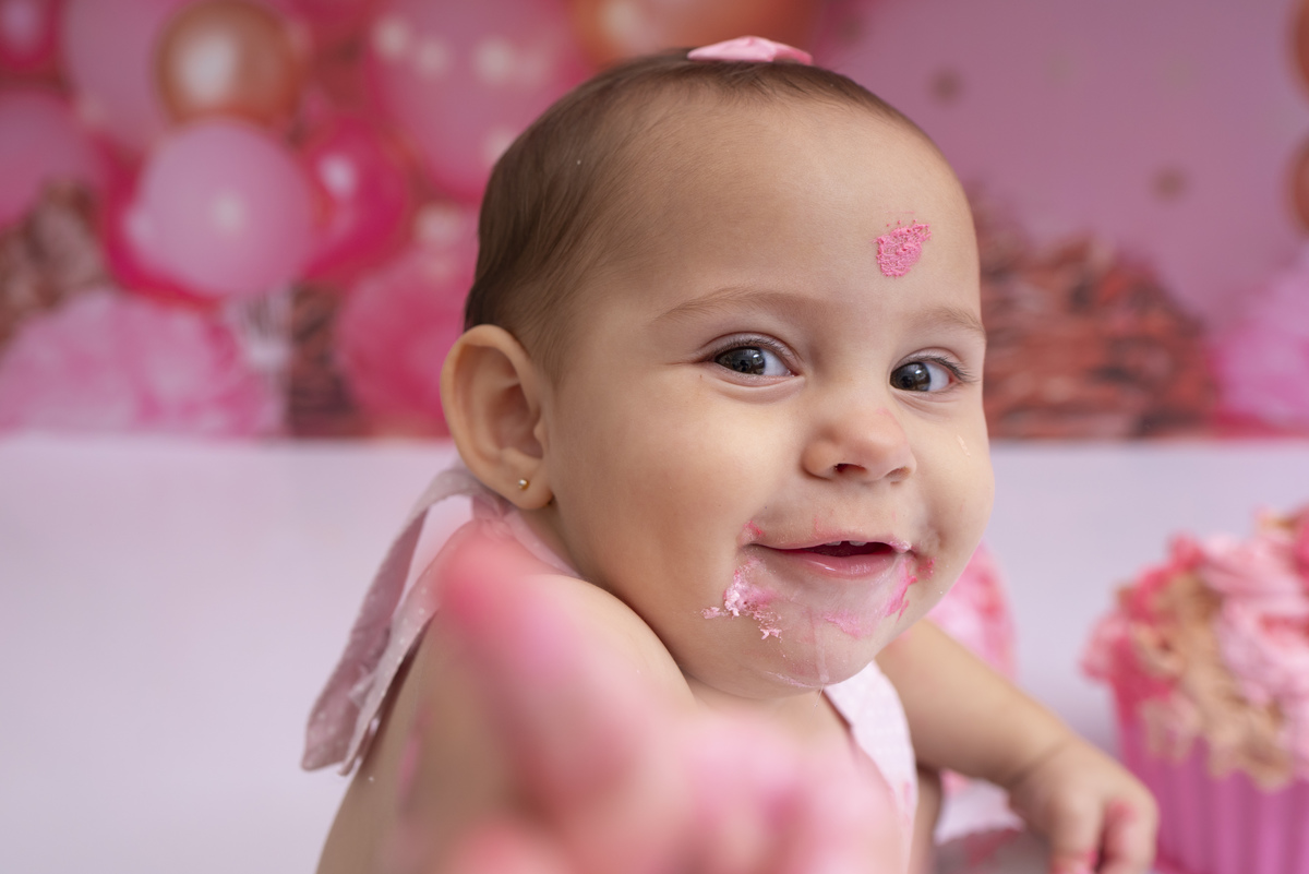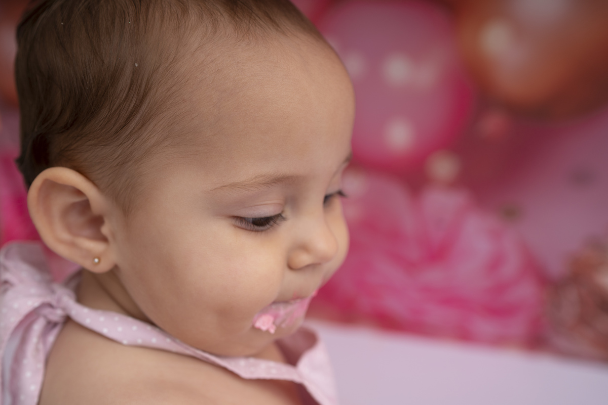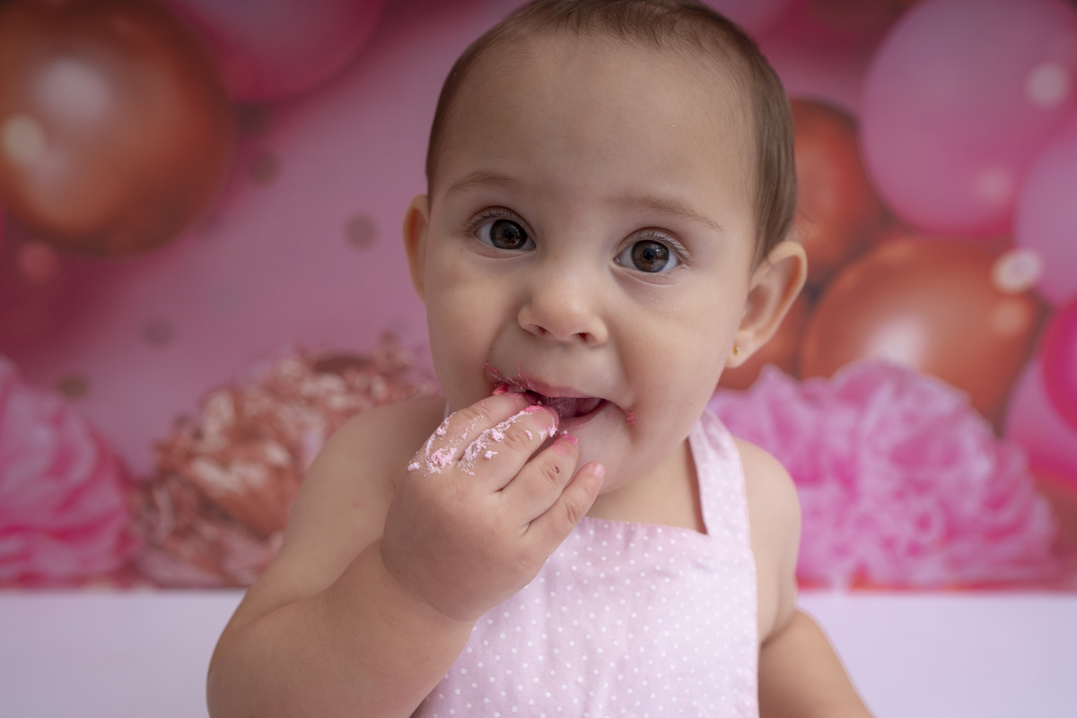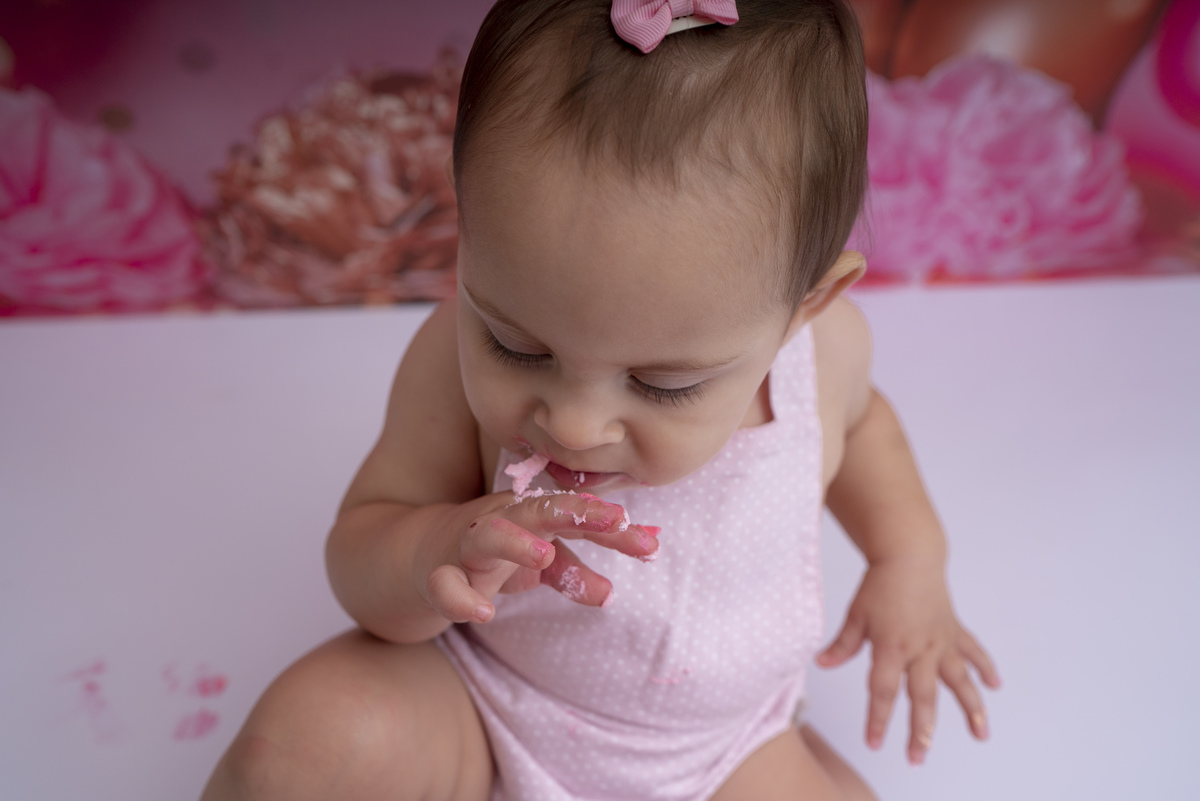 Bia e seu primeiro aninho descobrindo novas texturas (bolo sem açúcar, feito especialmente para bebês)!
